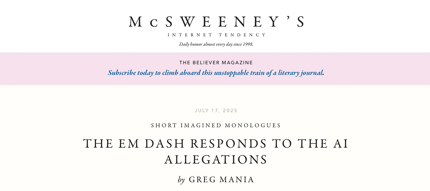 First, I handed the mic to the em dash. You can read its response to the AI allegations in my latest for McSweeney’s here.